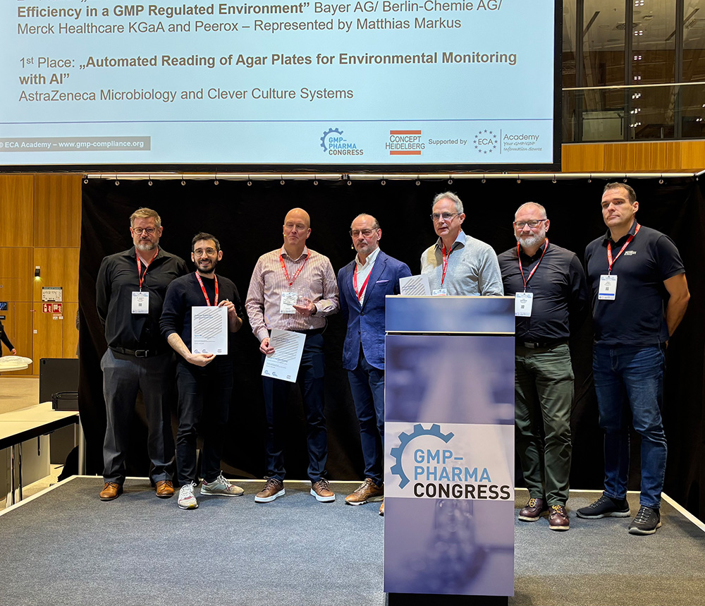 Altogether 23 projects were submitted for the Innovation Award 2026, from which the jury selected three finalists. In recognition of the project "Automated Reading of Agar Plates for Environmental Monitoring with AI", the Innovation Award 2026, endowed with EUR 5,000 went to AstraZeneca Microbiology. For the jury, this proposal represented the best combination of technical innovation and process simplification. Second place was awarded jointly to Bayer / Berlin-Chemie / Merck Healthcare for their projcet "MADDOX: AI-Based Assistance Software to Increase Production Efficiency in a GMP Regulated Environment", while third place went to Spore.Bio for their project "TMSI (Transformer-based Multimodal Spectral Imaging)".